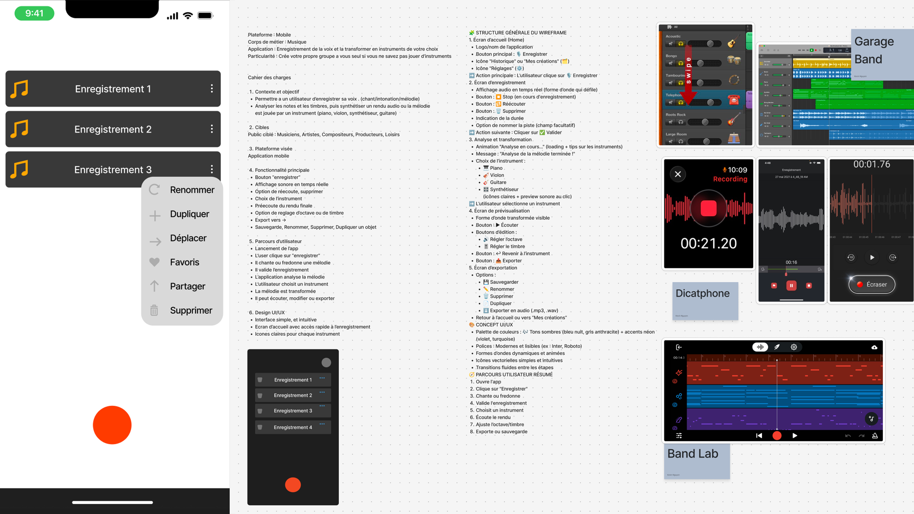 Le Figmap et Wireframe qui m'ont permis de construire mon application, suivis des recherches, du mood board et de mes inspirations. On y retrouve aussi le cahier des charges, les anciens prototypes et le plan de travail sur Figma.