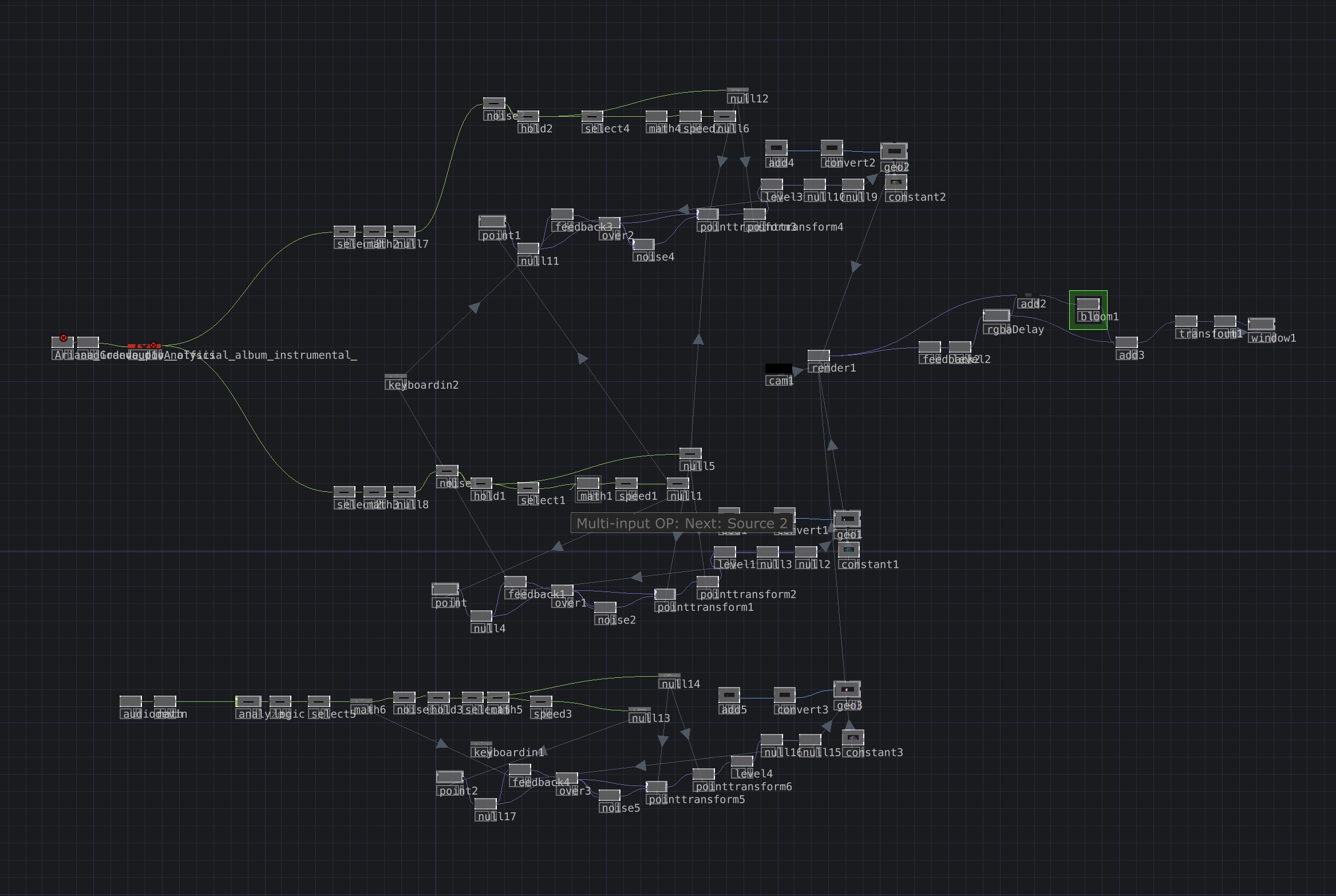 Branches dans l'application qui montre le procédé du dispositif. Un AudioAnalyser esta l'origine et vient séparer chaque élément d'une mélodie (kick, beat, bass, high,...) Suivis par un "select" qui va venir selectionner un élément de l'AudioAnalyser. Le select vient ensuite faire réagir les particules en fonction de l'élément déclencheur.